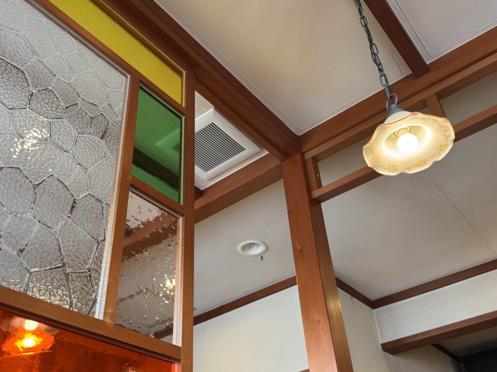 天井を見上げると、カラーガラスを使った窓がおしゃれで、