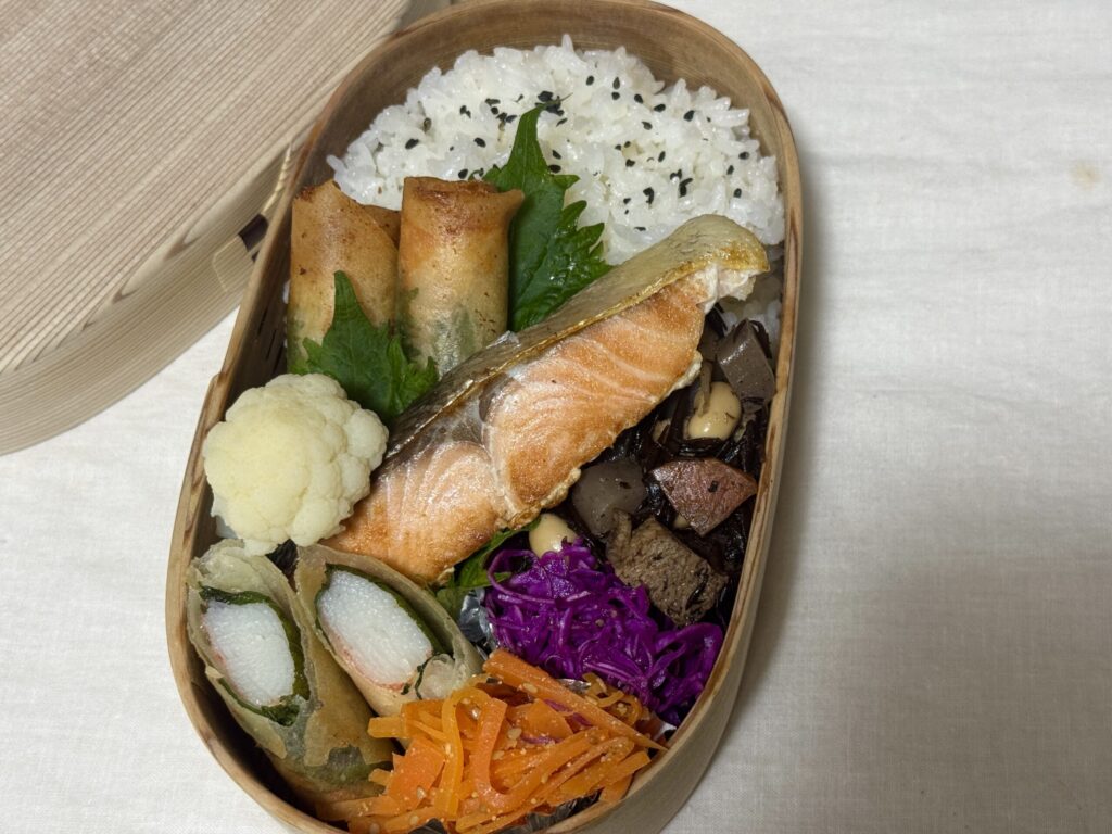 楽天で購入した骨取り鮭をメインにしたお弁当です。