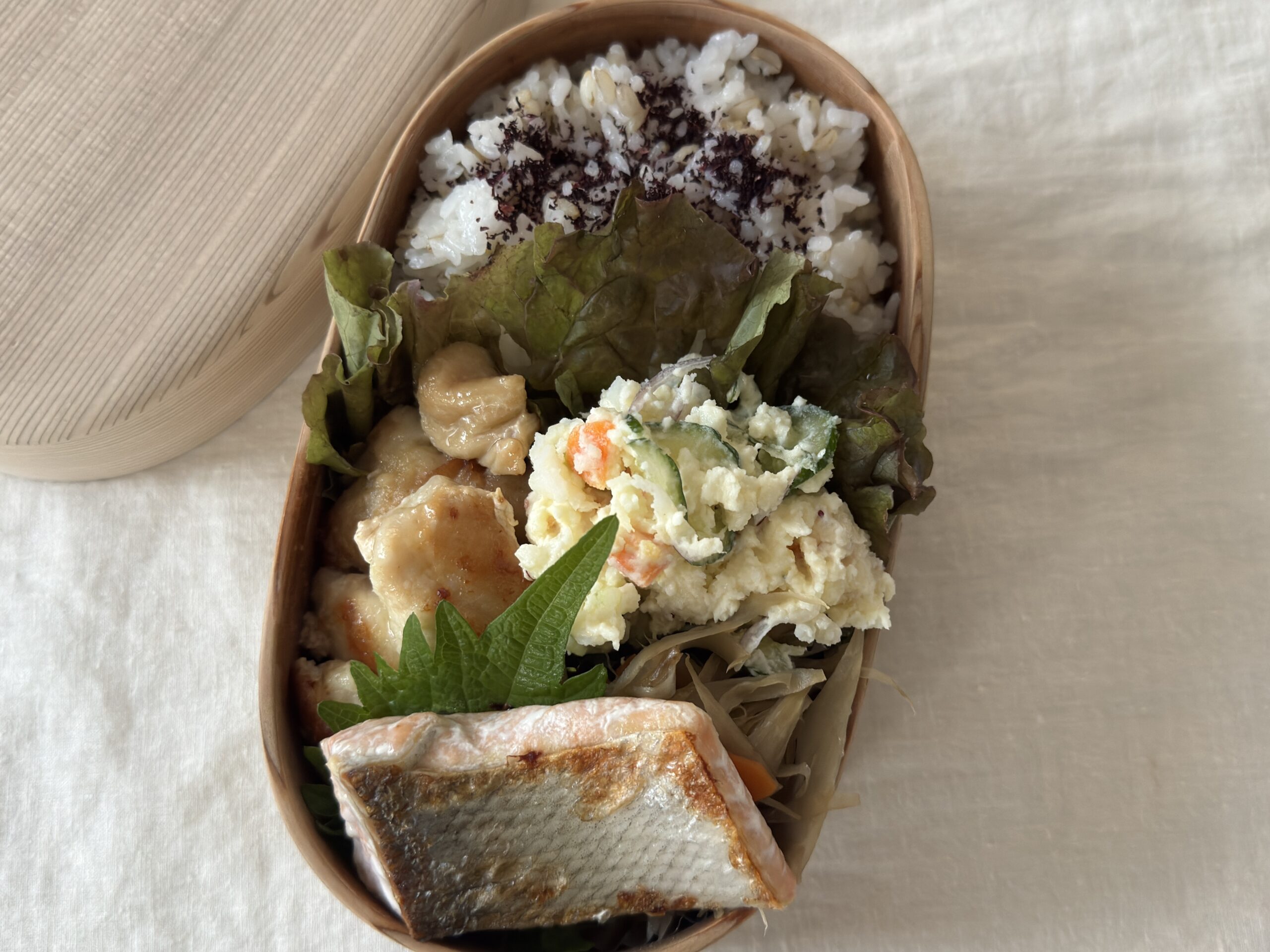 入れるおかずが少なかったからポテサラをてんこ盛りにしたよ💦